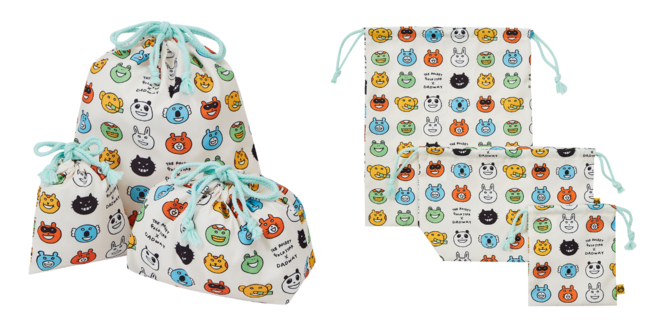 色とりどりのキャラクターが並ぶ総柄のアイテム、輪になって笑うキャラクターのイラストと色使いが印象的なアイテムなど、組み合わせて楽しいラインナップが揃いました。