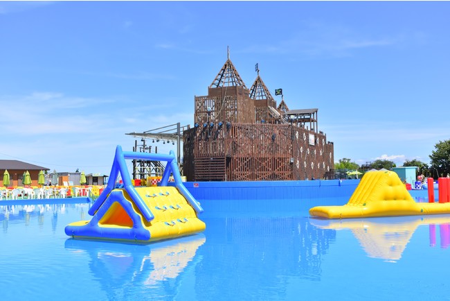 「ウォーターランドぷるぷる」は、すべり台などさまざまなフロートが浮かぶ広々とした空間で、子供から大人まで水遊びを満喫できる夏期限定の特設エリアです。
