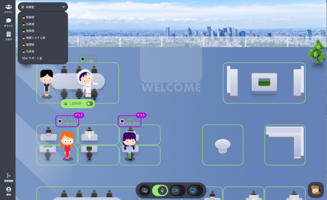 昨今では新型コロナウイルスの影響でオフラインで集まれる機会が減少しています。そこで、RISA内のフロアに外部の方を招待して「ちょっとしたオンライン飲み会」や「気軽に集まれる憩いの場」としてユーザーの方は勿論、ゲストもRISAフロアに集合して”まるでオンラインゲームのように”コミュニケーションが可能!