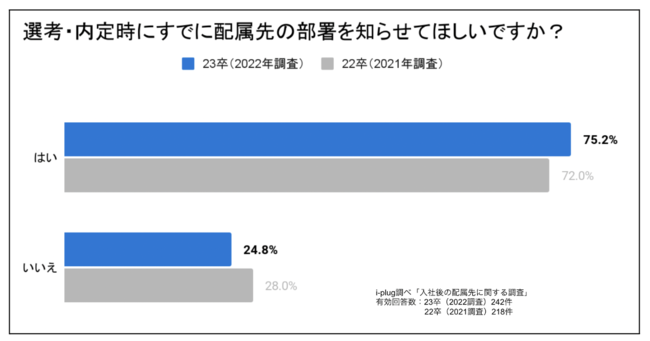 75.2%の学生が「はい」と回答しました。昨年、22卒学生へ実施した調査と比較すると大きな変化はありませんでした。
