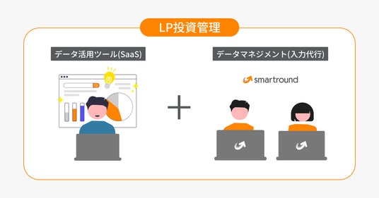 LP投資管理は「データ活用ツール(SaaS)」と「データマネジメント(データ入力代行)」がセットになったサービスです。決算書などの書類をツールに入力する作業はスマートラウンドが担当するため、ユーザーは入力済みのデータの活用に集中いただけます。