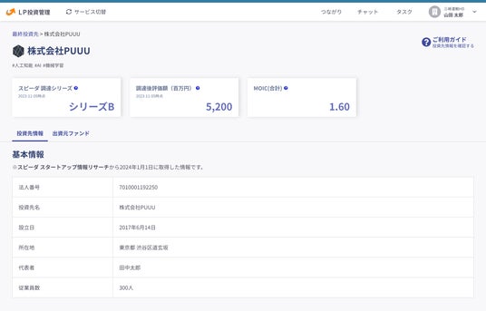 最終投資先(スタートアップ)の基本情報確認画面。