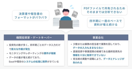 近年、ベンチャーキャピタル(VC)への投資をはじめとした、オルタナティブ投資に参入するLP投資家は増加し、運用額も増加しています。しかし、LP投資家が受領する決算書、報告書のフォーマットはバラバラで、その多くがPDFファイルで共有されています。