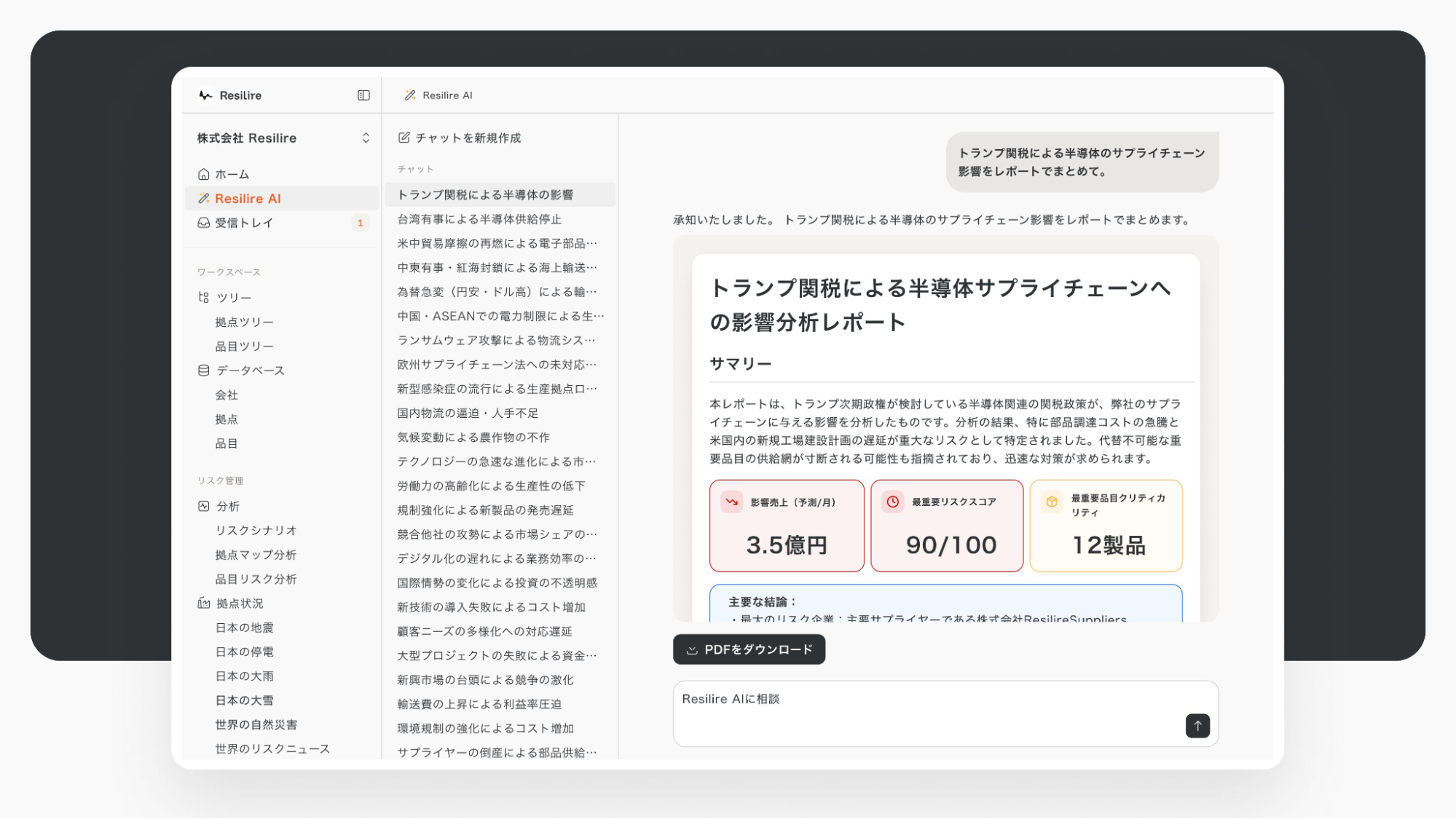株式会社Resilire(本社:東京都港区、代表取締役CEO:津田 裕大、以下Resilire)は、サプライチェーンリスク管理サービス「Resilire(レジリア)」の新機能として生成AIを活用した「Resilire AI Agent(レジリア・エーアイ・エージェント)」の提供を開始しました。一部の機能については、2026年春頃までに順次実装予定です。