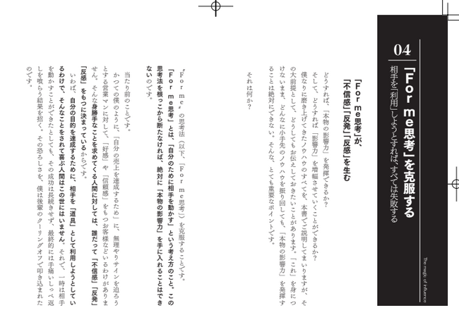 たとえ「理屈」を用いて、保険が必要な理由をロジカルに説明できたとしても、人は動かないー。人は感情で動く生き物であるため、相手の潜在意識に働きかけ、「この人なら信頼できる」「この人を応援したい」というポジティブな感情を持ってもらう。著者はこの力を「影響力」と名付け、この力を増幅させていくことで、営業マンとしての実績を飛躍的に向上させて行きました。ではどのように「影響力」を身に付け、数々の記録的な成績を残すことができたのか。そのスキルを余すことなく詰め込んだ、ビジネスパーソンが絶対に読んでおくべき1冊です。