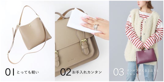 2.お手入れカンタン細かな凹凸の表情がある生地を使用。ハリとツヤがあり、上質感のある生地です。合皮はもともと水に強く汚れがつきにくいメリットがありますが、細かな凹凸合皮を使用することで、さらにお手入れがしやすく高級感を演出してくれます。かばんのお手入れに時間が掛けられない忙しい方へ助かるポイントです。
