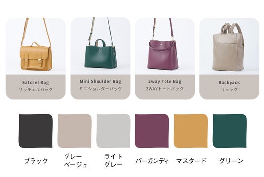 (左から)2WAYトートバッグ・ミニショルダーバッグ・サッチェルバッグ・リュック