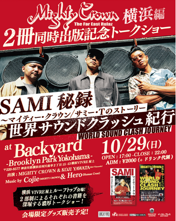 この度は10月29日(日)に、日本代表のみならず世界のレゲエアンバサダーやカルチャーアイコンとして活躍するレゲエサウンドグループ・Mighty Crownの出版記念トークショーを開催する運びとなりました。本トークショーはMighty Crownを紐解くヒストリー本、「SAMI秘録~マイティー・クラウン/サミー・Tのストーリー」、「世界サウンドクラッシュ紀行」の2冊同時出版記念としての実施となります。ぜひ会場へお越しください。