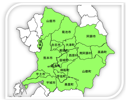 熊本市、山鹿市、菊池市、宇土市、宇城市、阿蘇市、合志市、美里町、大津町、菊陽町、高森町、西原村、南阿蘇村、御船町、嘉島町、益城町、甲佐町、山都町