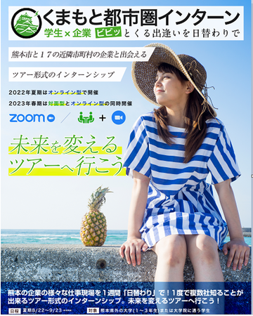 熊本県熊本市は、熊本県外に在住の大学生等を対象に、1週間日替わりで熊本連携中枢都市圏の企業をまわる「くまもと都市圏インターン」を開催します。