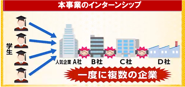これにより、学生はたくさんの業種や企業を知り、自分に合うしごとを見つけやすくなります。企業にとってはこのインターンシップに参加するたくさんの学生に、自社を知ってもらう機会となります。