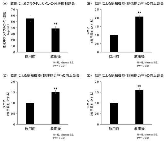 先の3種の生薬抽出物を含有した飲料を健康な成人(男性32名、女性10名、平均年齢=40.9歳)に3か月間飲用してもらい、飲用前後の唾液中フラクタルカイン量と認知機能について解析を行いました。その結果、飲用前と比較し、唾液中フラクタルカインの分泌が抑えられ(図5A)、認知機能を測定する各種テストのスコアが増加しました(図5B-D)。