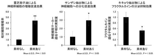 フラクタルカインは神経幹細胞の神経新生を抑制し、認知機能を低下させてしまいます。そこで、フラクタルカインの分泌を抑制し、神経新生を促進する生薬の探索を行いました。その結果、霊芝の胞子から抽出した油(霊芝胞子油)に神経幹細胞の増殖を促進する効果、「サンザシ」の抽出物に神経幹細胞の神経細胞への分化を促進する効果、「キキョウ」の抽出物にフラクタルカインの分泌を抑制する効果を発見しました(図3)。