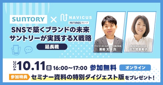 SNSを通じて企業様や地方自治体様のコミュニケーション支援サービスを提供する株式会社NAVICUS(本社:東京都千代田区、代表取締役:武内 一矢、以下:NAVICUS)が、マーケティングや企業のコミュニケーション実務に関わる方々を対象とした無料ウェビナー『SNSで築くブランドの未来~サントリーが実践するX戦略~延長戦』を2024年10月11日(金)に開催いたします。