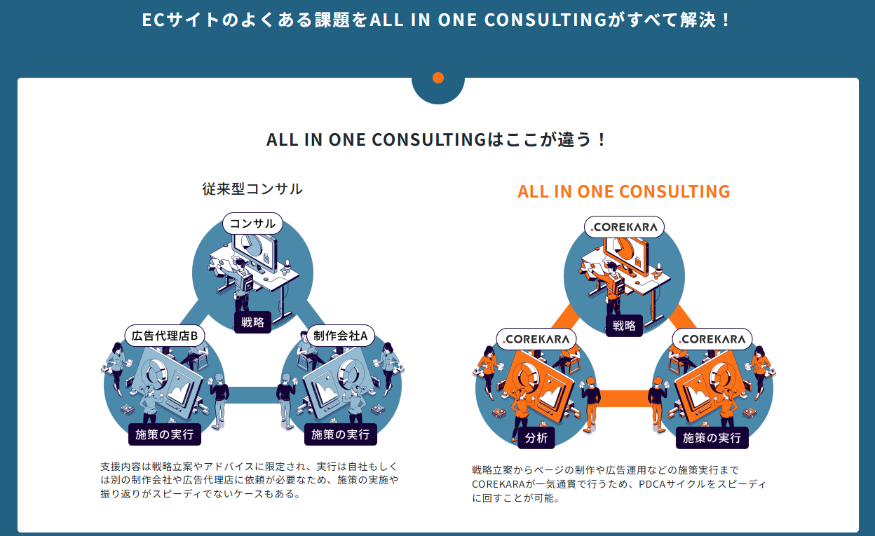「ALL IN ONE CONSULTING」は、自社ECの戦略の策定から広告運用、CRM施策、サイト構築やページ作成等、売上UPに必要な作業を見極め、一気通貫で支援する自社EC特化のコンサルティングサービスです。