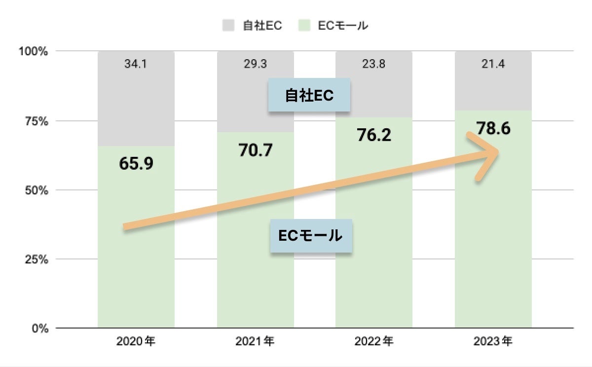 現在、株式会社デジタルコマース総合研究所の調査が示す通り、EC市場ではモールEC化率が一貫して上昇。モールの利便性が向上する一方で、出店手数料の高騰や過度な値下げ競争、ブランドイメージの希薄化に悩む事業者は増加の一途をたどっています。