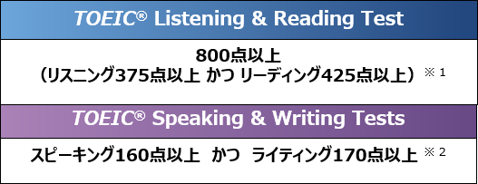 同一年内(1~12月)にTOEIC L&R、TOEIC S&Wの公開テストを受験し、以下の基準のスコアを取得した受験者。