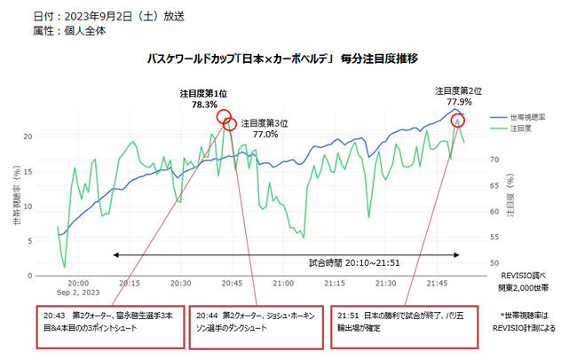 ご家庭に人体認識技術を搭載した機器を設置し、テレビスクリーンへの「注視」を測るREVISIO株式会社(旧TVISION INSIGHTS、本社:東京都千代田区、代表取締役社長 郡谷康士、以下REVISIO)は、9月2日(土)に地上波テレビ朝日系列で放送された、FIBAバスケットボールワールドカップ2023「日本×カーボベルデ」について、どのシーンが一番視られていたのか、毎分の注目度データを使って分析致しました。(注目度が高いことは、テレビの前の視聴者がくぎづけになったことを表します)