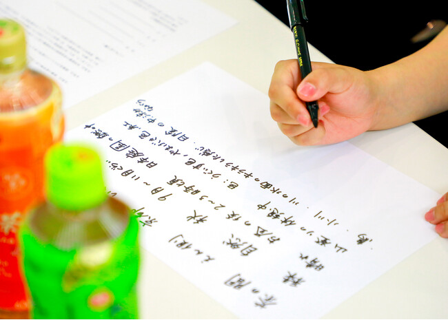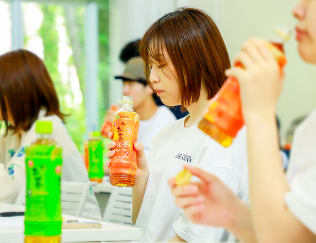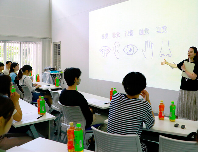 千葉大学の大学1年生~大学院2年生までの6学年、約25名の学生を対象に、感性教育プログラム「香りから物語を創る授業」を実施。ひとり1本ずつ伊藤園の「お~いお茶 緑茶」「お~いお茶 ほうじ茶」が配られ、実際に「香り」を感じ・味わいながら、「香り」から連想する感覚・景色・色・生き物など、様々な角度から言語化していき、言葉をもとに物語を創作。学生の皆さんから、想像力溢れるオリジナルの「香り」の物語がたくさん生まれました。