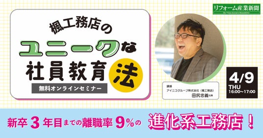 アイニコグループ株式会社(代表者:田尻 忠義、所在地:奈良県奈良市、以下、当社)が展開する住宅事業ブランド「楓工務店」は、2026年4月9日(木)、株式会社リフォーム産業新聞社主催の無料オンラインセミナーに登壇し、建築業界における重要課題である「人材育成・定着」をテーマに、当社独自の社員教育・人材育成ノウハウを公開することをお知らせいたします。