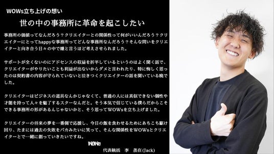 我々WOWsが目を向けるところは決してクリエイターではなく「クリエイティブ」と「支えてくれるファン」であることであると所属クリエイターとよく話しております。