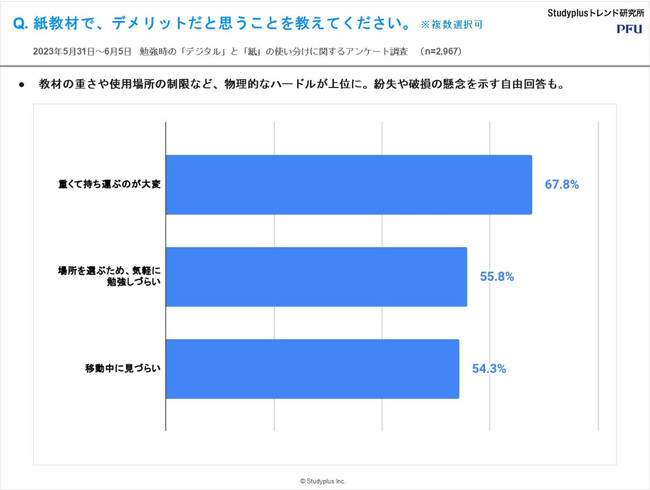 学習管理アプリ「Studyplus」をご利用の2,967名の中高生からアンケートを集計した結果、紙教材で勉強する際にデメリットだと感じられることとして最も多かったのが「重くて持ち運ぶのが大変(67.8%)」で、次いで「場所を選ぶため、気軽に勉強しづらい(55.8%)」「移動中に見づらい(54.3%)」と、大量の教材の持ち運びや勉強場所の確保に課題を感じている学生が多いことが判明しました。