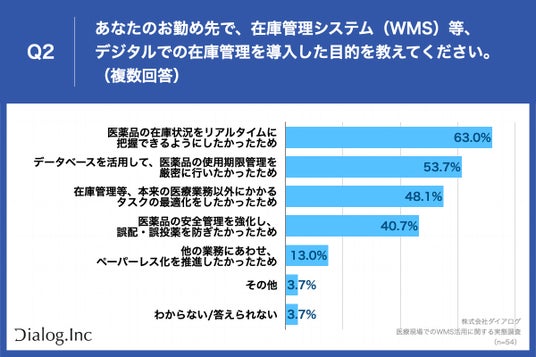 Q1で「在庫管理システム(WMS)等、デジタルでの管理」と回答した方に、「Q2.あなたのお勤め先で、在庫管理システム(WMS)等、デジタルでの在庫管理を導入した目的を教えてください。(複数回答)」(n=54)と質問したところ、「医薬品の在庫状況をリアルタイムに把握できるようにしたかったため」が63.0%、「データベースを活用して、医薬品の使用期限管理を厳密に行いたかったため」が53.7%、「在庫管理等、本来の医療業務以外にかかるタスクの最適化をしたかったため」が48.1%という回答となりました。