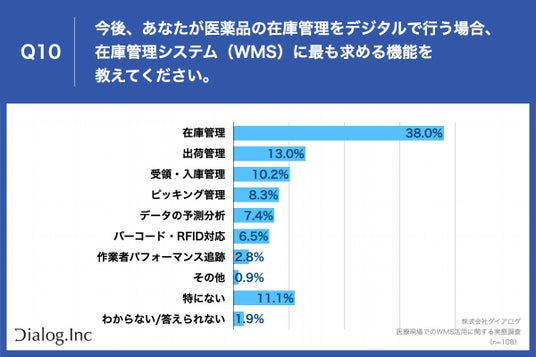 「Q10.今後、あなたが医薬品の在庫管理をデジタルで行う場合、在庫管理システム(WMS)に最も求める機能を教えてください。」(n=108)と質問したところ、「在庫管理」が38.0%、「出荷管理」が13.0%、「受領・入庫管理」が10.2%という回答となりました。