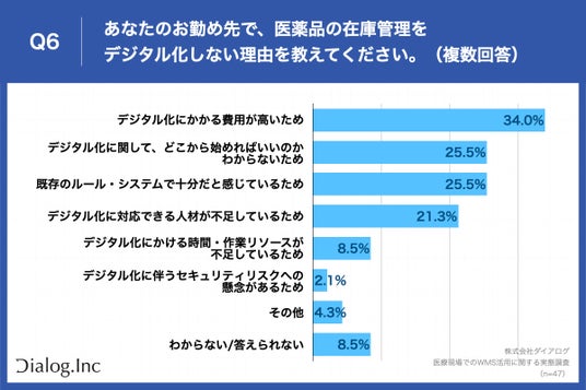 Q1で「紙・エクセル等、アナログ・人力での管理」と回答した方に、「Q6.あなたのお勤め先で、医薬品の在庫管理をデジタル化しない理由を教えてください。(複数回答)」(n=47)と質問したところ、「デジタル化にかかる費用が高いため」が34.0%、「デジタル化に関して、どこから始めればいいのかわからないため」が25.5%、「既存のルール・システムで十分だと感じているため」が25.5%という回答となりました。
