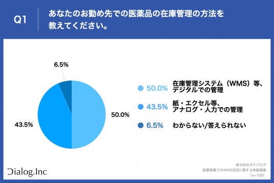 「Q1.あなたのお勤め先での医薬品の在庫管理の方法を教えてください。」(n=108)と質問したところ、「在庫管理システム(WMS)等、デジタルでの管理」が50.0%、「紙・エクセル等、アナログ・人力での管理」が43.5%という回答となりました。