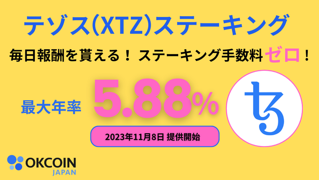 本参加を機に、OKCoinJapanのステーキングサービスにおいて、『テゾス(XTZ)』を2023年11月8日(水)に追加することをお知らせいたします。