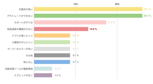 アンケートによれば、「手数料が高い」「デモトレードが実装されていない」ことを改善点として挙げた投資家が共に26.1%で最も多かった。また、「十分なサポートが受けられない(17.4%)」「取扱通貨の種類が少ない(13.0%)」といった不満も多く見られた。