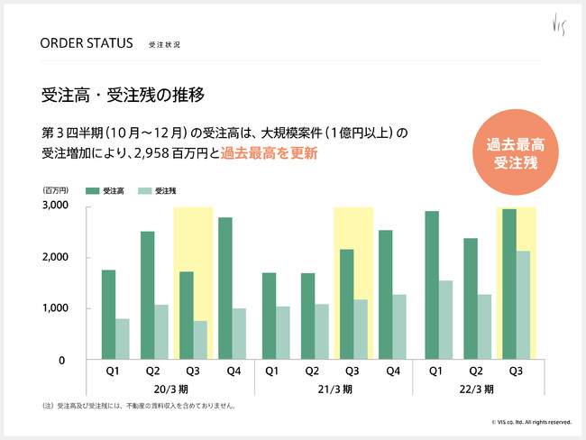 第3四半期(10-12月)の受注高は、大規模案件(1億円以上)の受注増加により、 29億58百万円と過去最高を更新しました。