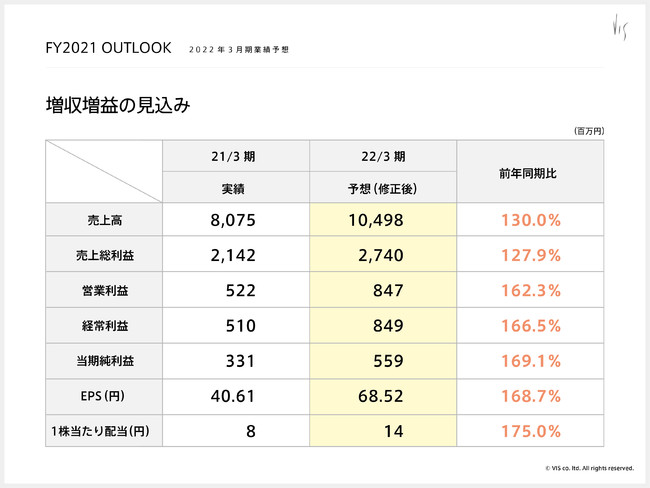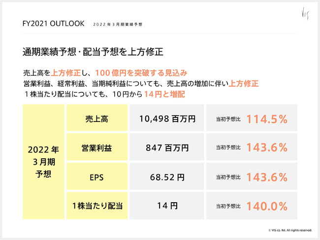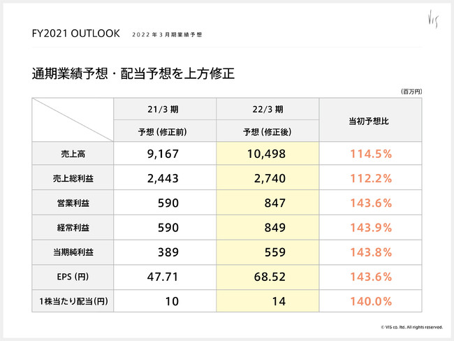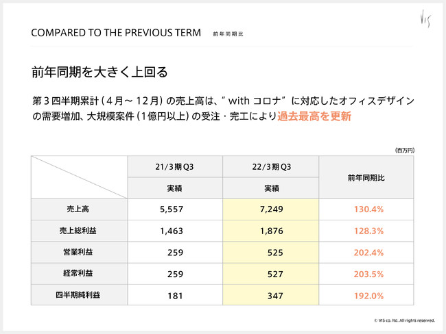 デザイナーズオフィス事業を手がけ、「はたらく」をデザインする株式会社ヴィス(本社:大阪市北区、代表取締役社長:中村勇人)は、2022年2月14日、2022年3月期第3四半期決算を発表しました。第3四半期累計の売上高は72億49百万円で前年同期比130.4%、営業利益は5億25百万円で前年同期比202.4%と過去最高を更新しました。また通期業績予想・配当予想を上方修正し、通期の売上高は100 億円を突破する見込みです。