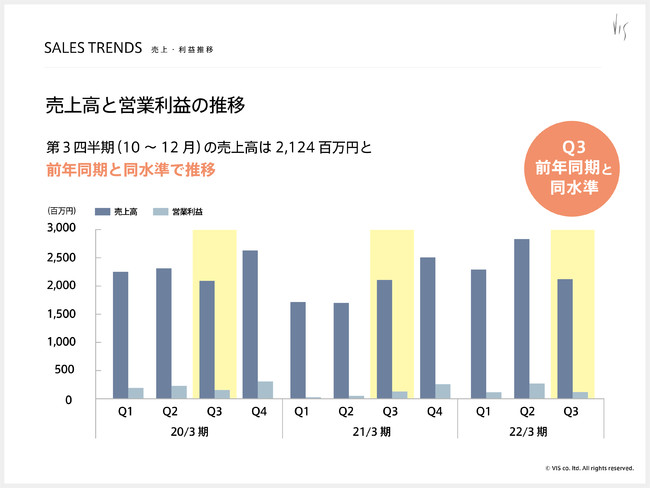 第3四半期(10-12月)の売上高は21億24百万円となり、前年同期と同水準で推移しています。