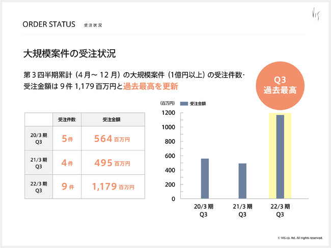 第3四半期累計(4月-12月)の大規模案件(1億円以上)の受注件数・受注金額は9件・11億79百万円と過去最高を更新しました。