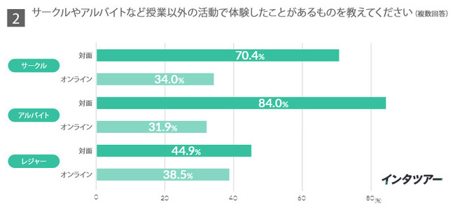 アルバイト、サークルの経験は対面で70%以上、オンラインも30%を超える