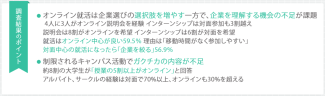 調査結果では、オンライン就活は企業選びの選択肢を増やす一方で、企業を理解する機会の不足が課題となっていること、制限されるキャンパス活動でガクチカ(学生時代に力を入れたこと)の内容が不足している様子などがわかりました。