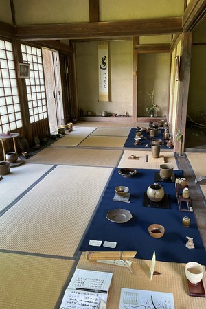 志戸呂(しとろ)焼の細井陶游さん、石彫刻家の土屋誠一さん による⼆人展。古寺と石地蔵に守られた倍増パワースポットでの開催です。