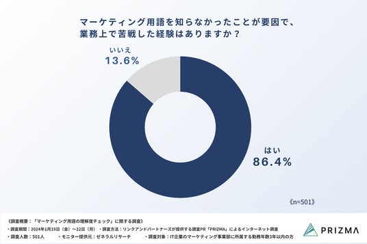 さらに、「Q4:マーケティング用語を知らなかったことが要因で、業務上で苦戦した経験はありますか?」という質問に対しては、多数の回答者(86.4%)が「はい」と回答し、これはマーケティング用語の知識不足が業務における具体的な障害となっている現実を浮き彫りにしているといえるでしょう。