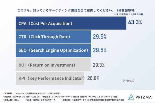 ・最も知られているマーケティング用語は、「CPA(Cost Per Acquisition)」が43.3%と判明。