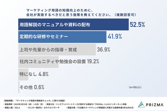 最後に、「Q10:マーケティング用語の知識向上のために、会社が実施するべきだと思う施策を教えてください。(複数回答可)」では、「用語解説のマニュアルや資料の配布」が52.5%で最も支持され、「定期的な研修やセミナー」が41.9%、そして「上司や先輩からの指導・育成」が36.9%と続きました。この結果からは、用語の理解を深め、業務効率を向上させるためには、教育的アプローチと資料の提供が重要であることを示唆しています。