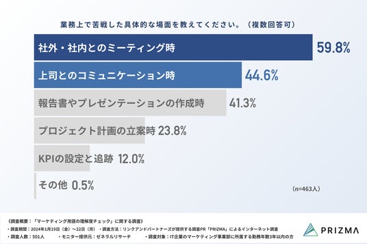 ・業務上で苦戦した具体的な場面は、「社外・社内とのミーティング時」が59.8%で最多に。