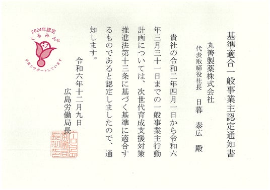 丸善製薬株式会社(本社:広島県尾道市、代表取締役社長:日暮泰広)は、「次世代育成支援対策推進法」に基づき、厚生労働大臣より仕事と子育ての両立を支援する取り組みが優良であることが認められ、「くるみん」認定を2024年12月9日に取得しました。2025年1月23日、広島労働局にて「くるみん」認定通知書交付式が行われました。