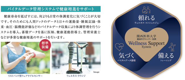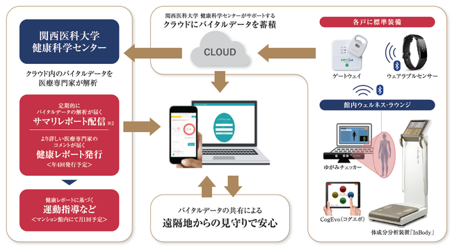 日々のバイタルデータを最新測定機器から収集・管理、各自の健康状況の変化をチェックし、関西医科大学健康科学センターがレポートを発行。館内にて健康指導やセミナーなどを実施。