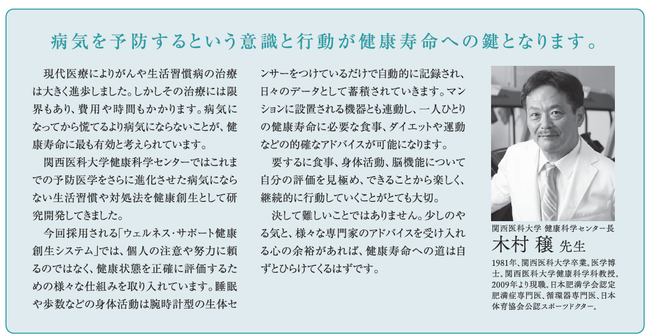 京阪電鉄不動産株式会社(大阪市中央区、代表取締役 道本能久)・ミサワホーム株式会社(東京都新宿区、代表取締役 作尾徹也)・関西医科大学(大阪府枚方市、理事長 山下敏夫)・コガソフトウエア(東京都台東区、代表取締役 古賀詳二)の4社は提携して最新の健康科学で健康寿命を支える「ウェルネス・サポートシステム」を開発しました。新築マンションプロジェクト、「ファインレジデンス枚方香里園町」全130邸に日本で初めて導入。マンションの竣工と同時に稼働を開始します。