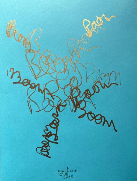 読めるはずの言葉が読めなくなるほど塗り重ねられたとき、画面に立ち上がるのは「意味」ではなく、手の動きや速度、圧力です。「描く/書く」という区別がほどけ、行為そのものが紙の上に直接刻まれる点が作品の魅力のひとつです。