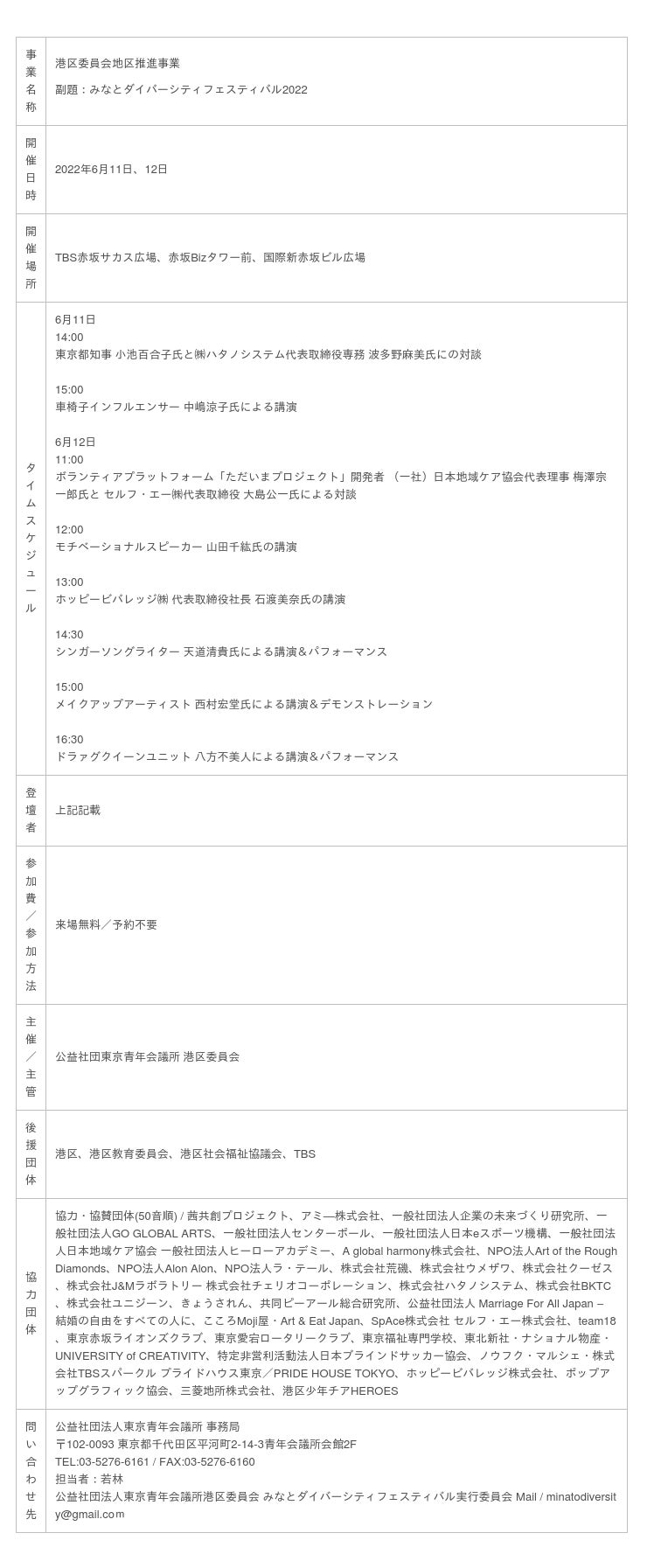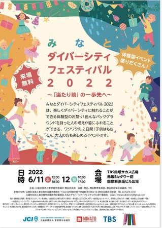 東京青年会議所では、6月11日(土)・12日(日)の2日間にわたり、TBS赤坂サカス広場、赤坂Bizタワー前、国際新赤坂ビル広場にてダイバーシティフェスティバルを行います。