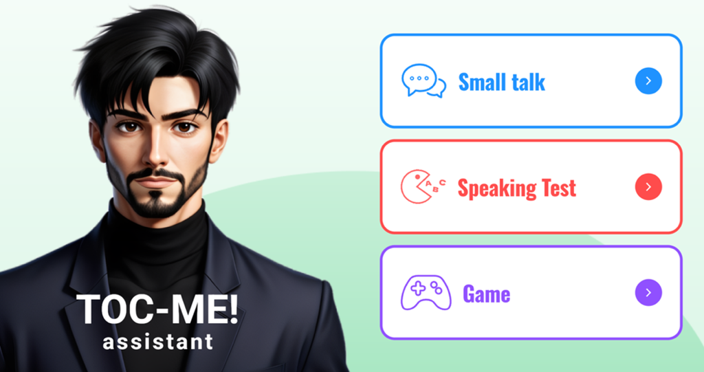 TOC-ME!assistantは、ボタンひとつでネイティブレベルの英語を話すAIアバターを呼び出せます。授業の狙いに合わせたSmall talkやSpeaking Test対策をその場で展開でき、文法・テーマ・単語を選ぶだけで会話が自動生成されます。AIアバターがネイティブスピーカーのように言い換え・聞き返し・追加質問をしてくれるので、自然な対話を続けることができます。