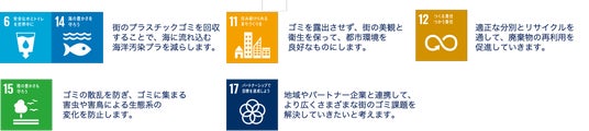 これらの機能を活用することで、ゴミの適切な管理、ゴミの回収業務のスマート化、資源循環の促進等に取り組み、SDGsの推進、持続可能な街づくりに貢献します。「SmaGO」の設置は、国連が定めたSDGsの17のゴールのうち、6つのゴールに対応しています。